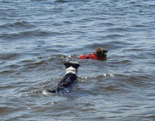 P.S. Wow! I almost forgot! The coolest tests of our dog's left & right skills have sometime come in the water, quite by chance when they are retrieving/looking for bumpers. This weekend's swim was no different! Quite unplanned, when Bungee's bumper was floating off in a strong current, I tried giving her a "left" command and boom - she cracked off a left turn, and "Oh! there it is!" saw it, and made a beeline straight for her bumper. Later on I had a chance to successfully use her right command when a poor throw & the currents had sent everyone in a snarl of wrong directions. Sometime with currents & winds it can take some doing to keep each dog swimming toward their own mark. Imagine our delight to see some recognition that Bungee is already understanding her directionals too, not once but several times. Just brilliant!